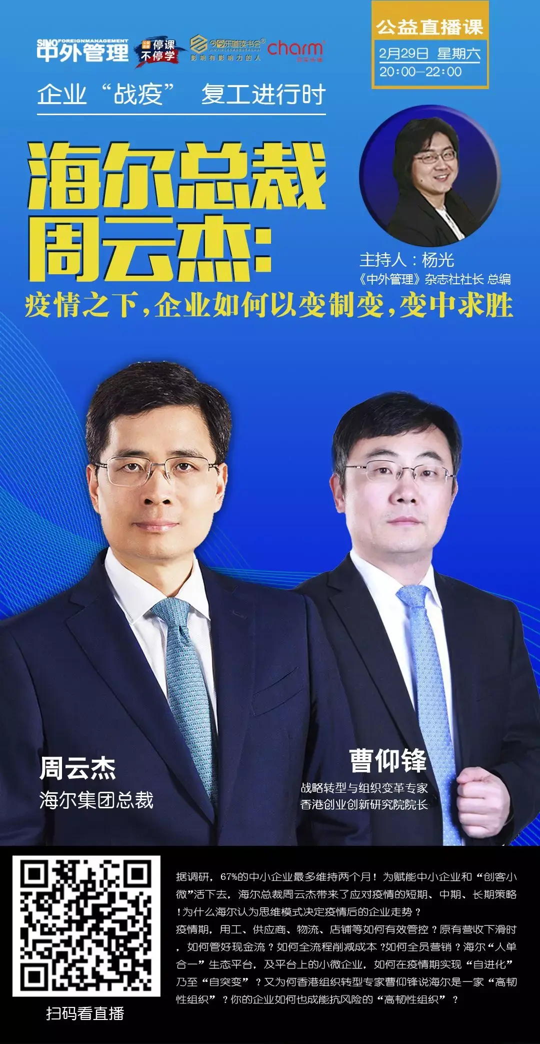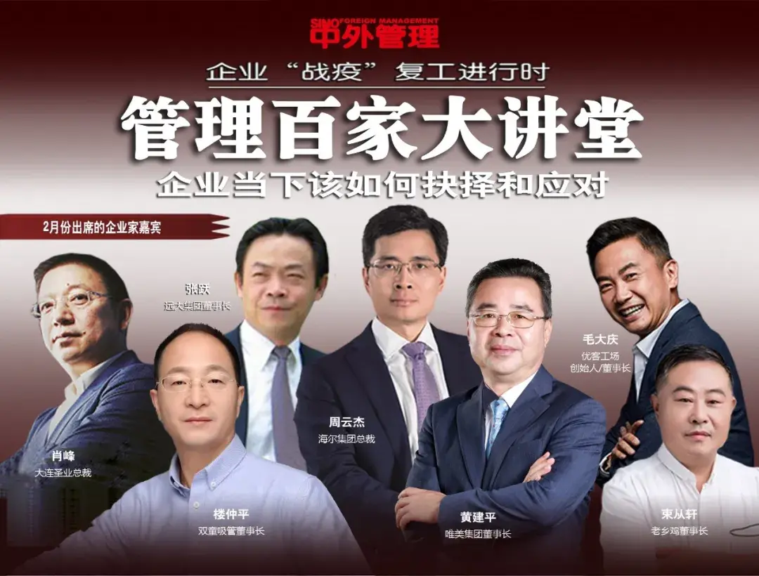 2月29日(周六)晚20:00,《中外管理之企业“战疫”复工进行时》第8期作为特别公益专场,我们特邀海尔集团总裁周云杰,分享《疫情之下,企业如何以变制变,变中求胜》,解读企业应对疫情的短中长期策略,给中小企业提供专属“定制”的管理输出和思维赋能。