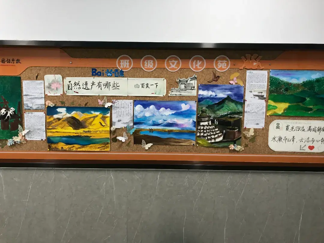 为了将中华文化镌刻于全体师生心田,摄乐校区组织开展了“探寻世界遗产内蕴,弘扬中华优秀文化”的班级文化苑布置和宣讲评比活动。高中以世界自然遗产为题、初中以世界文化遗产为题分别展开布置。