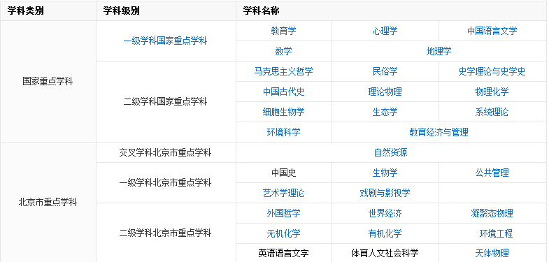 “七五”、“八五”期间,北京师范大学被确定为国家首批重点建设的十所大学之一。“九五”期间,又被首批列入“211工程”建设计划。2002年百年校庆之际,教育部和北京市决定重点共建北京师范大学,北京市第九次党代会将北京师范大学列入支持建设的世界一流大学的行列。“十五”期间,学校进入国家“985工程”建设计划。2017年,学校进入国家“世界一流大学”建设A类名单,11个学科进入国家“世界一流学科”建设名单。