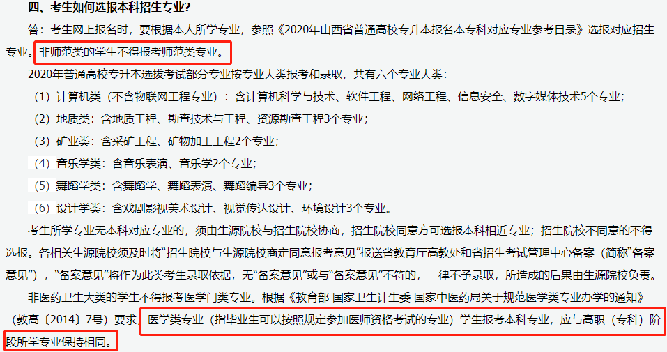 举个栗子,医学类就严格要求考生专科所学专业就是医学相关专业,如山西专升本要求:非医药卫生大类不得报考医学专业,却所报专业必须与专科所学专业保持相同;