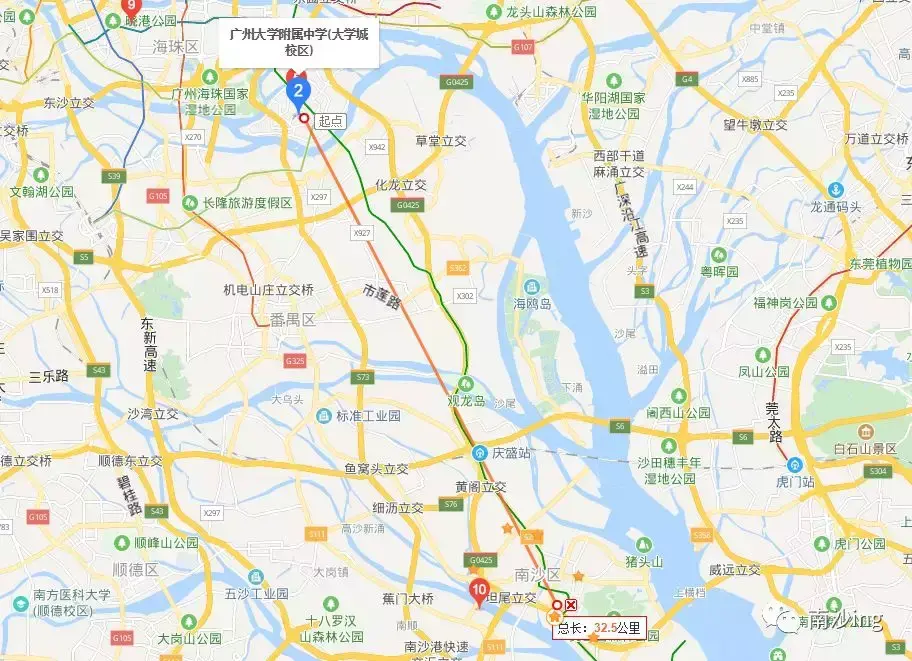 但是学校规划就在今年开始招生了,那么怎么破呢?当然是借读了,不过你可以要看清楚了,本次广大附中南沙实验学校需要到广州大学附属中学(大学城校区)上课,什么意思呢?就是说你住在南沙,但是上课哦,麻烦你要到大学城去上课哦!什么个概念呢?看看下面的地图就知道了!