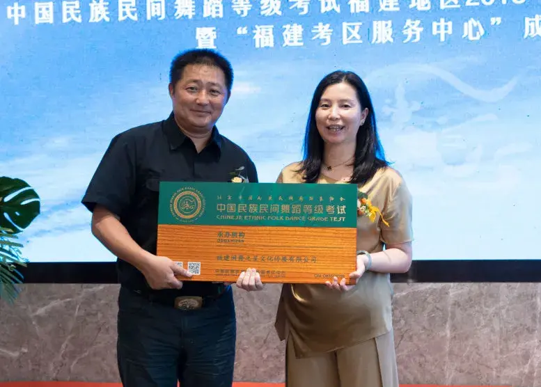 随后,吴海文副主任代表“考级中心”,为林峰主任、曾若虹副主任颁发“福建考区服务中心”牌匾;为“福建闽舞之星文化传播有限公司”颁发“承办机构”牌匾。