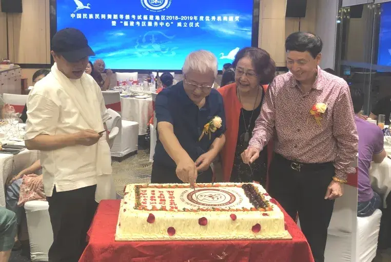 答谢晚宴上,福建考区服务中心特别准备了祝福蛋糕,吕艺生教授、孙龙奎教授、种俐俐副主任、曾若虹副主任与大家一同分享,祝愿福建地区中国民族民间舞考级迎来更加美好的明天!