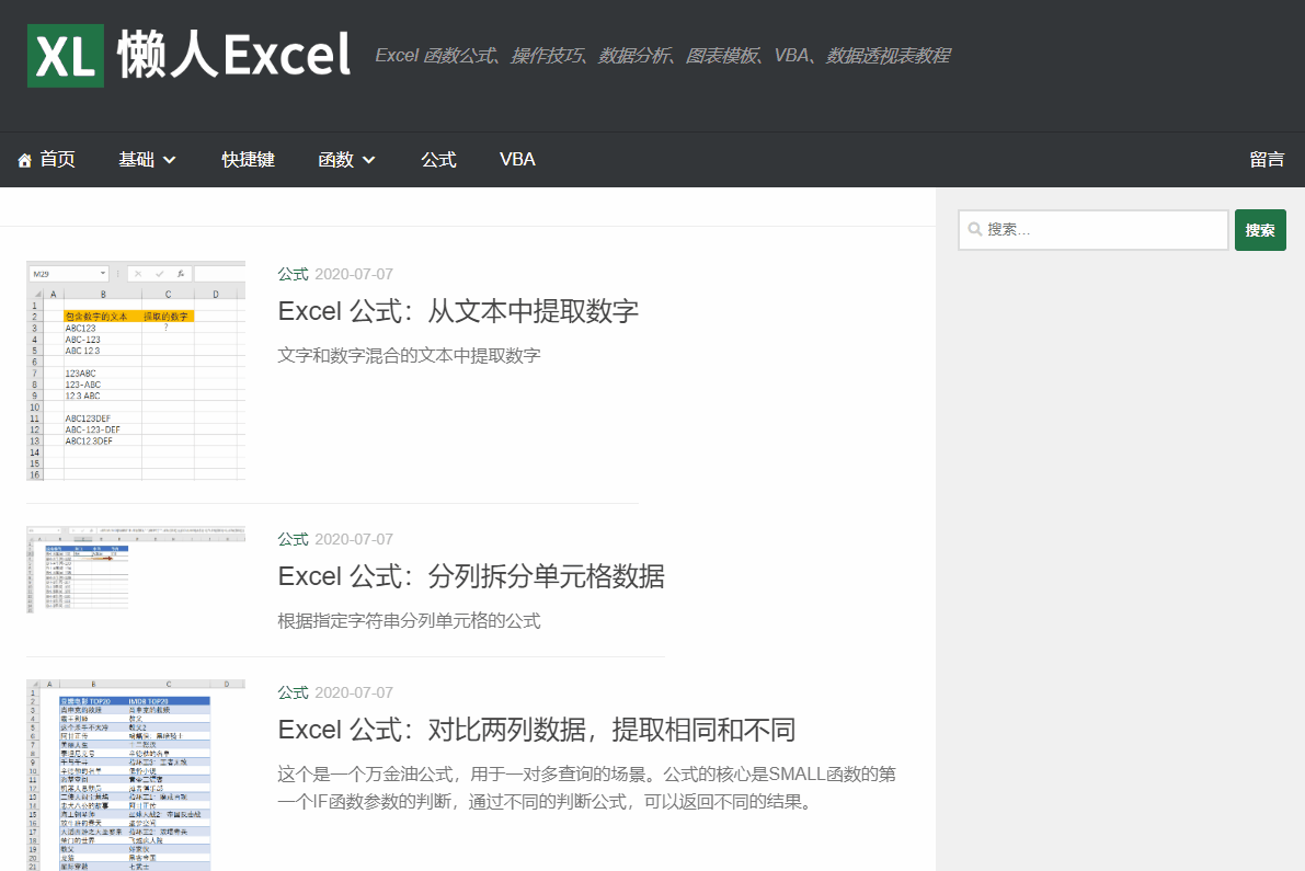 看名字就知道,这是一个学习Excel技能的网站,除了一些基础的操作技巧,还提供了Excel函数大全和公式大全,每一种函数公式都有举例说明,然后操作演示,小白也能看懂。关于Excel快捷键,也全部分门别类了。