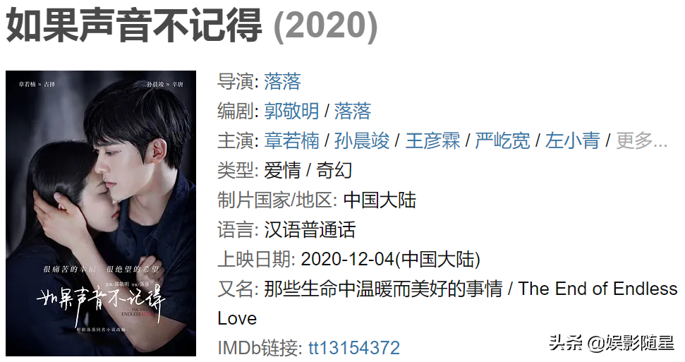 目前从《如果声音不记得》在豆瓣显示的资料来看,该片已经正式确定在2020年的12月4号首映上线(也算是指日可待了呢)。不知道大家对于章若楠和孙晨竣这2位新生代“高颜值CP”的表现,还有哪些不一样的看法和期待呢?欢迎在下方留下您独到的观点和意见哦!