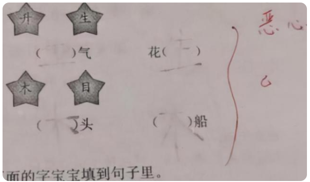 在一张小学一年级的语文试卷上,我们隐隐约约地看到学生用铅笔写着的“生”和“木”字,字写得比较大所以明显出格了,看上去也并不工整。而在题目旁边赫然写着“恶心”二字。