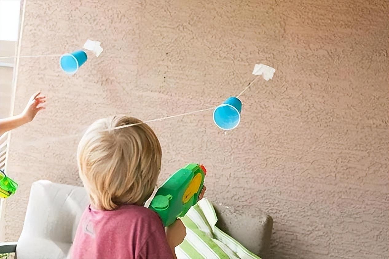 玩法:准备一条细绳,将纸杯或者塑料杯穿入绳子中,再将绳子固定住。用水枪射击着杯子,在水的冲力下,杯子会往前移动,两个小朋友比赛,看谁先到终点,先到积一分。