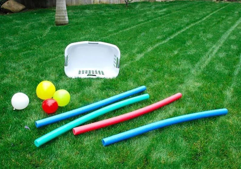 准备:水气球、泡沫棒,篮子