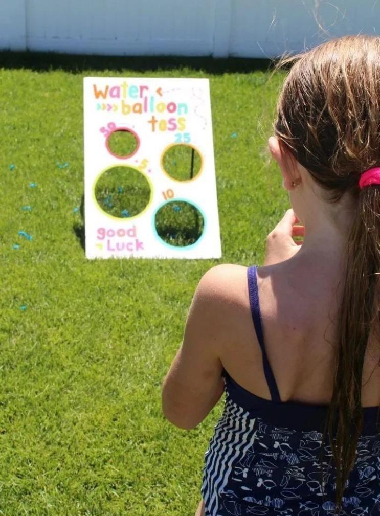 玩法:小朋友站在起点,用手投掷水气球,投中相应的小孔,对应得分。洞口越小,难度越大,分数当然也就越高。