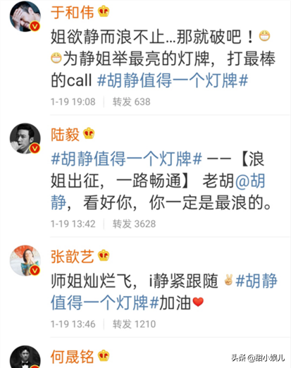 不过在胡静官宣的文案下,于和伟,陆毅,何晟铭,张歆艺等人高举"胡静灯牌"助威打call,转发的明星之多也能窥见胡静曾经的热度之高,人缘之好。