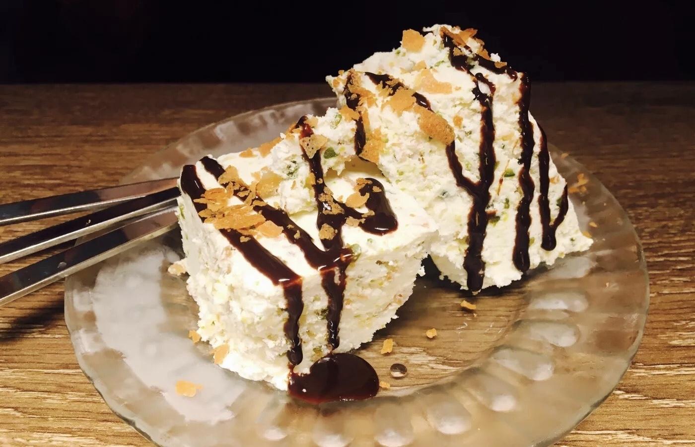 自制坚果牛轧糖冰淇淋吃起来不太像冰淇淋,感觉很微妙,里面是慕斯、巧克力蛋糕和冰淇淋的组合,有一点点像小时候吃的方砖冰糕。