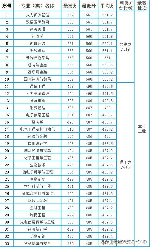 文史类专业录取最高分568分(财务管理、新闻传播学类),录取最低分560分,超过省控线31分;理工类专业录取最高分510分(电气工程及其自动化),录取最低分485分(超过省控线70分),最低分位次92329位。(详见下表)