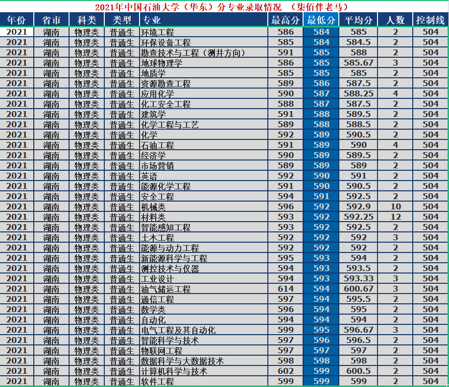 2021年中国石油大学(华东)分专业录取数据一览(湖南)