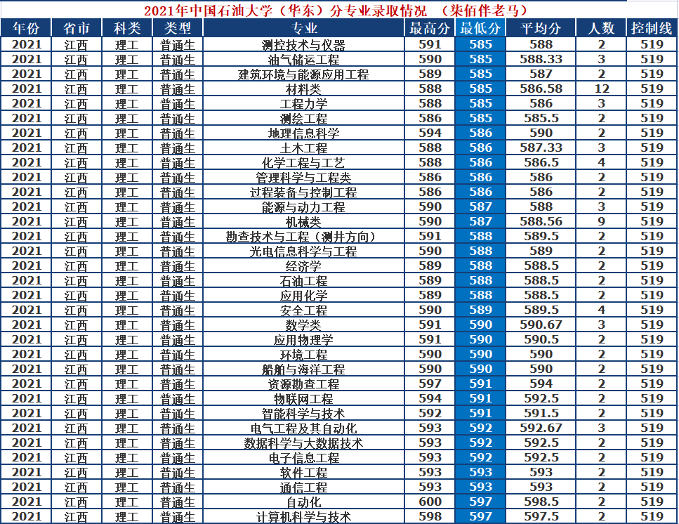 2021年中国石油大学(华东)分专业录取数据一览(江西)