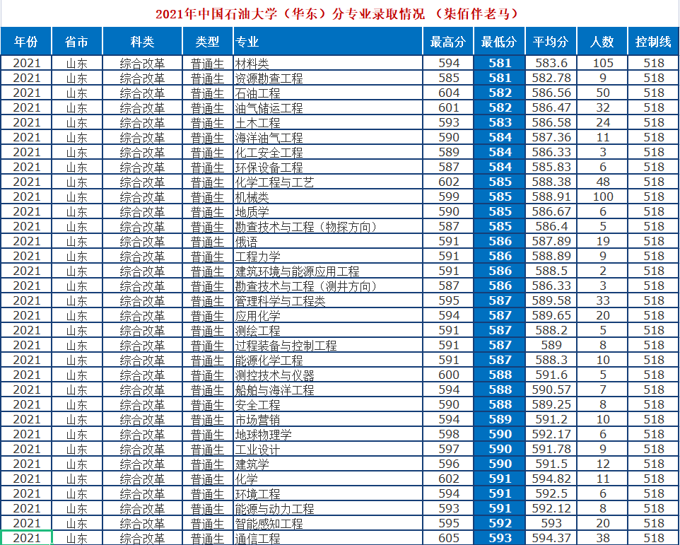 2021年中国石油大学(华东)分专业录取数据一览(山东)