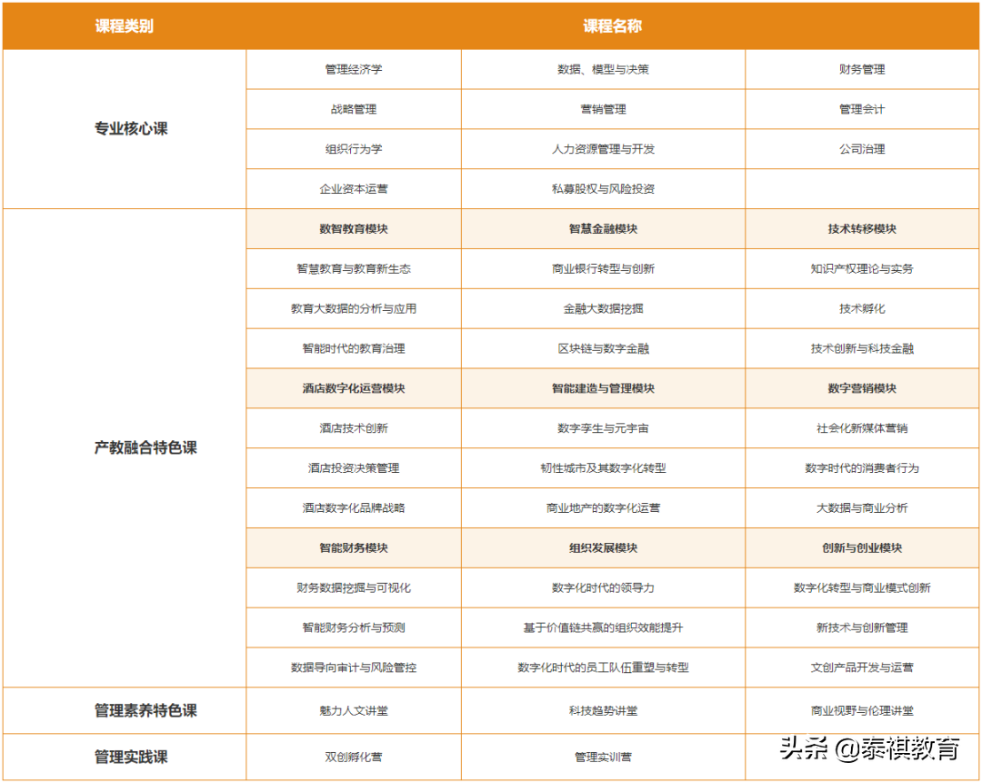 MBA项目实行学分制培养模式,学生修满规定学分,并通过硕士论文学位答辩后准予毕业。专业课的课程体系包括专业核心课、产教融合特色课、管理实践课、管理者素养特色课四类。