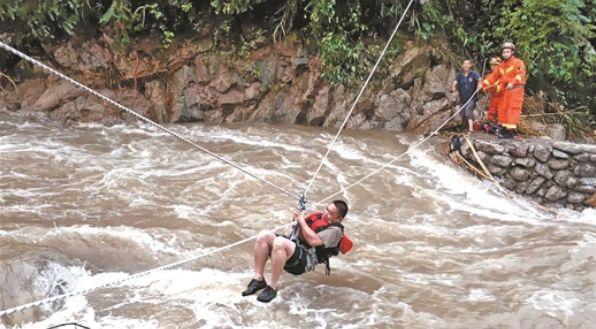 救援人员利用绳索横渡过河救人。 蒋森彪摄