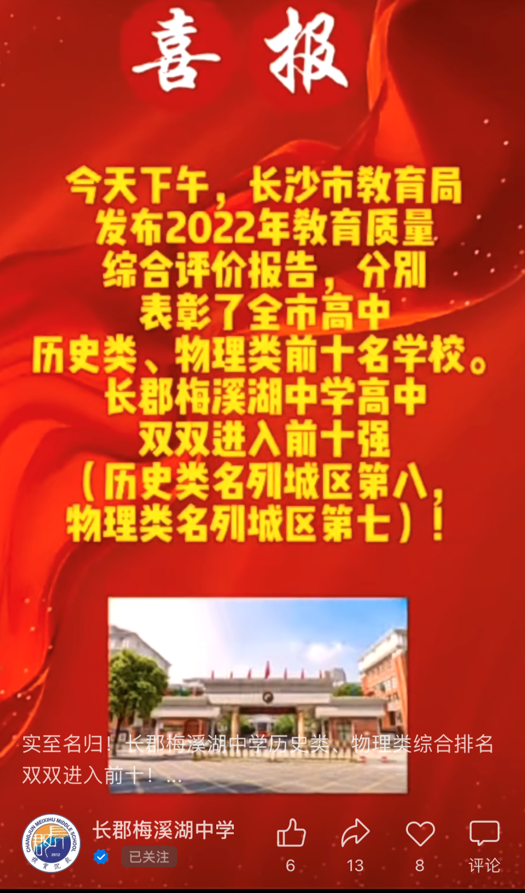 2022年教育质量综合评价报告中,长梅高中部获得全市高中历史类第八、物理类第七。