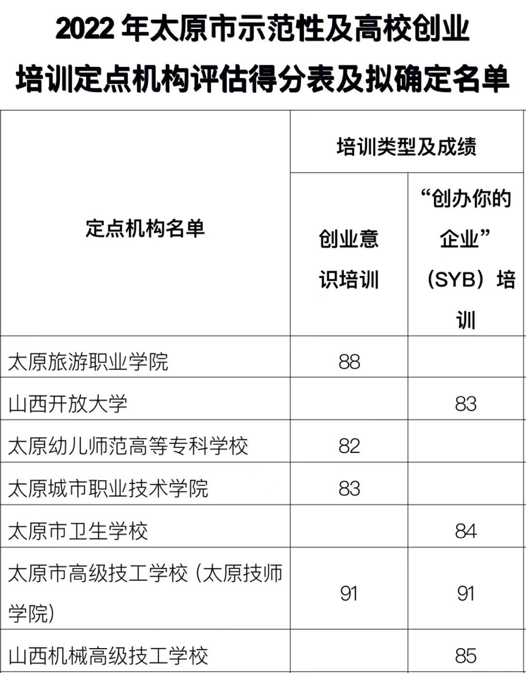 根据太原市人社局《关于开展太原市2022年创业培训定点机构评估认定工作的通知》,组织4名职业培训专家组成评估认定工作组,于4月26日对7个申报示范性及高校创业培训定点机构进行了评估认定,最终7个机构分值达到80分以上(评估合格);如认为有不符合政策规定或实际情况的,请向太原市人社局职业能力建设科反馈。