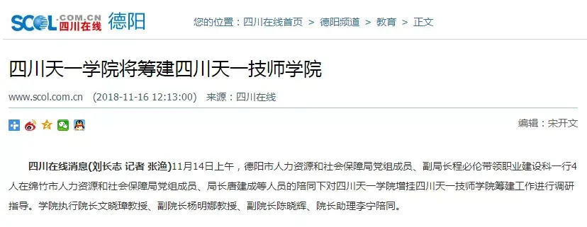 我们在网上查阅了关于“四川天一技师学院”的消息,发现四川天一学院于2018年就已经在筹办四川天一技师学院。