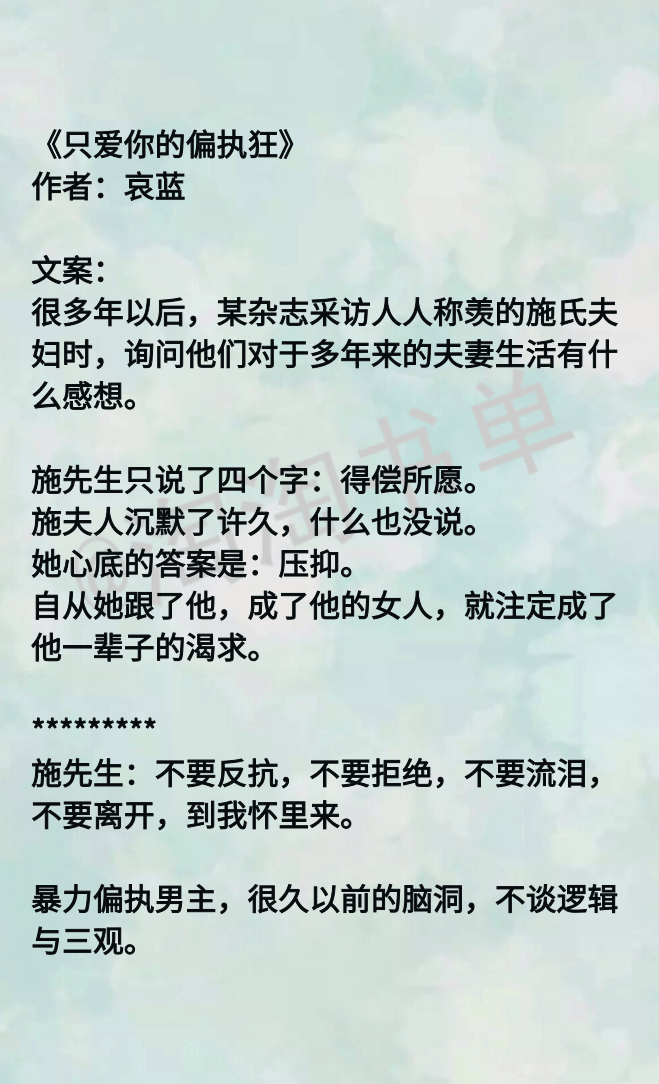 男主偏执狂有病占有欲极强,且强取豪夺。而且是不尊重女主的那种,之前看的都是男主其他方面会惯着女主。这里就是男主要求女主像他要求的那样活着,不能忤逆