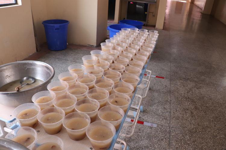 学生志愿者和食堂工作人员为学生提前盛好饭菜