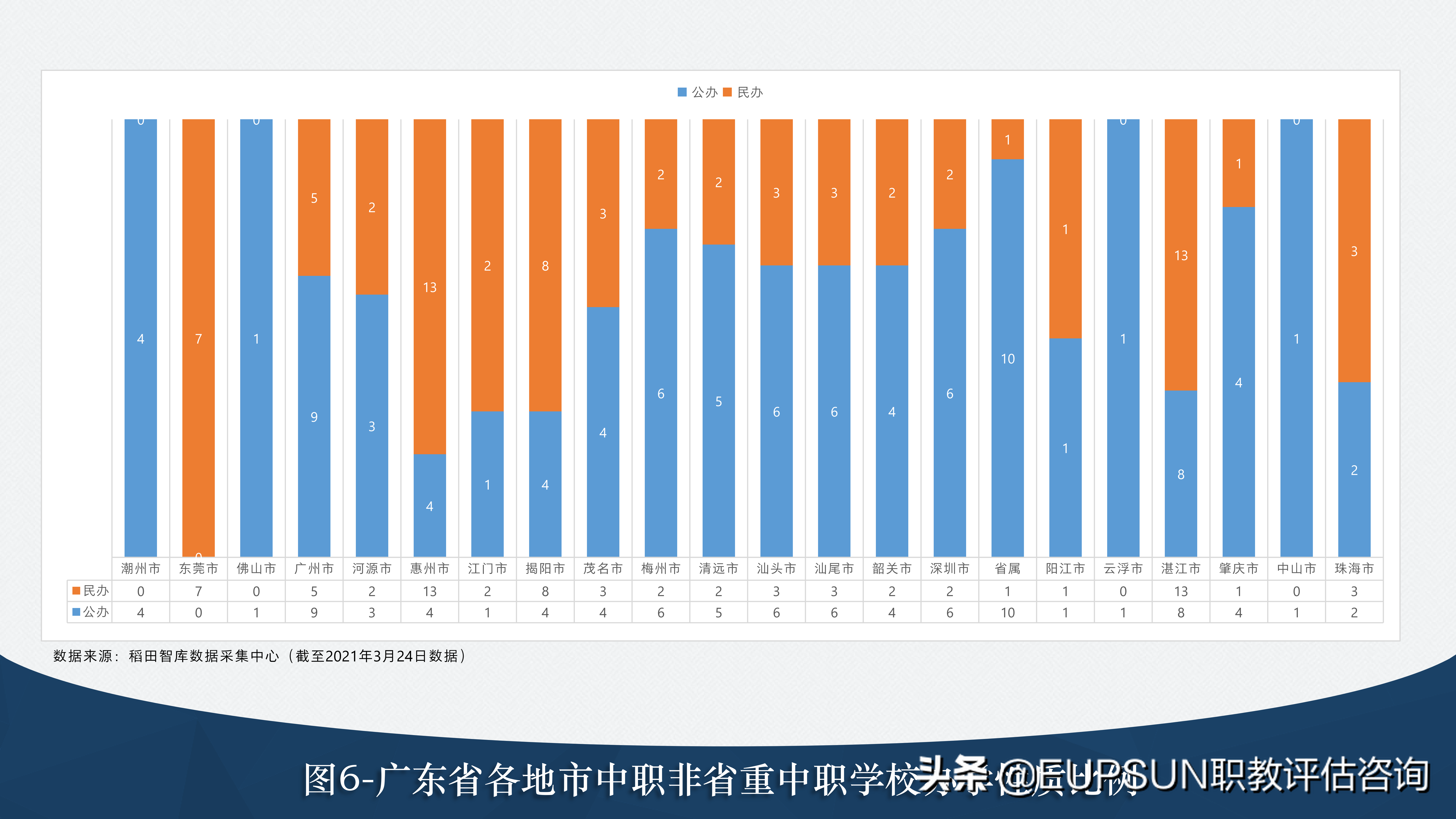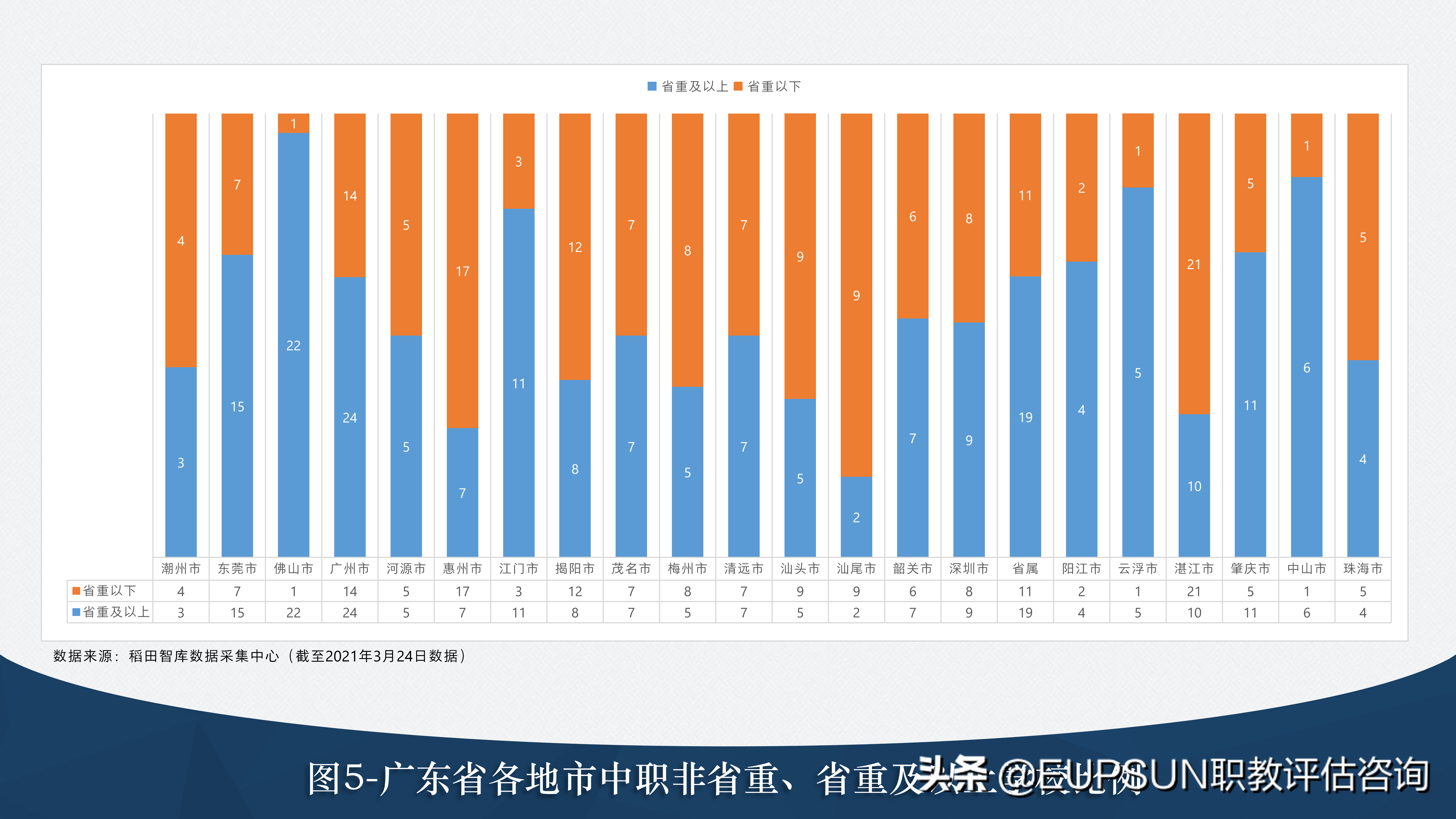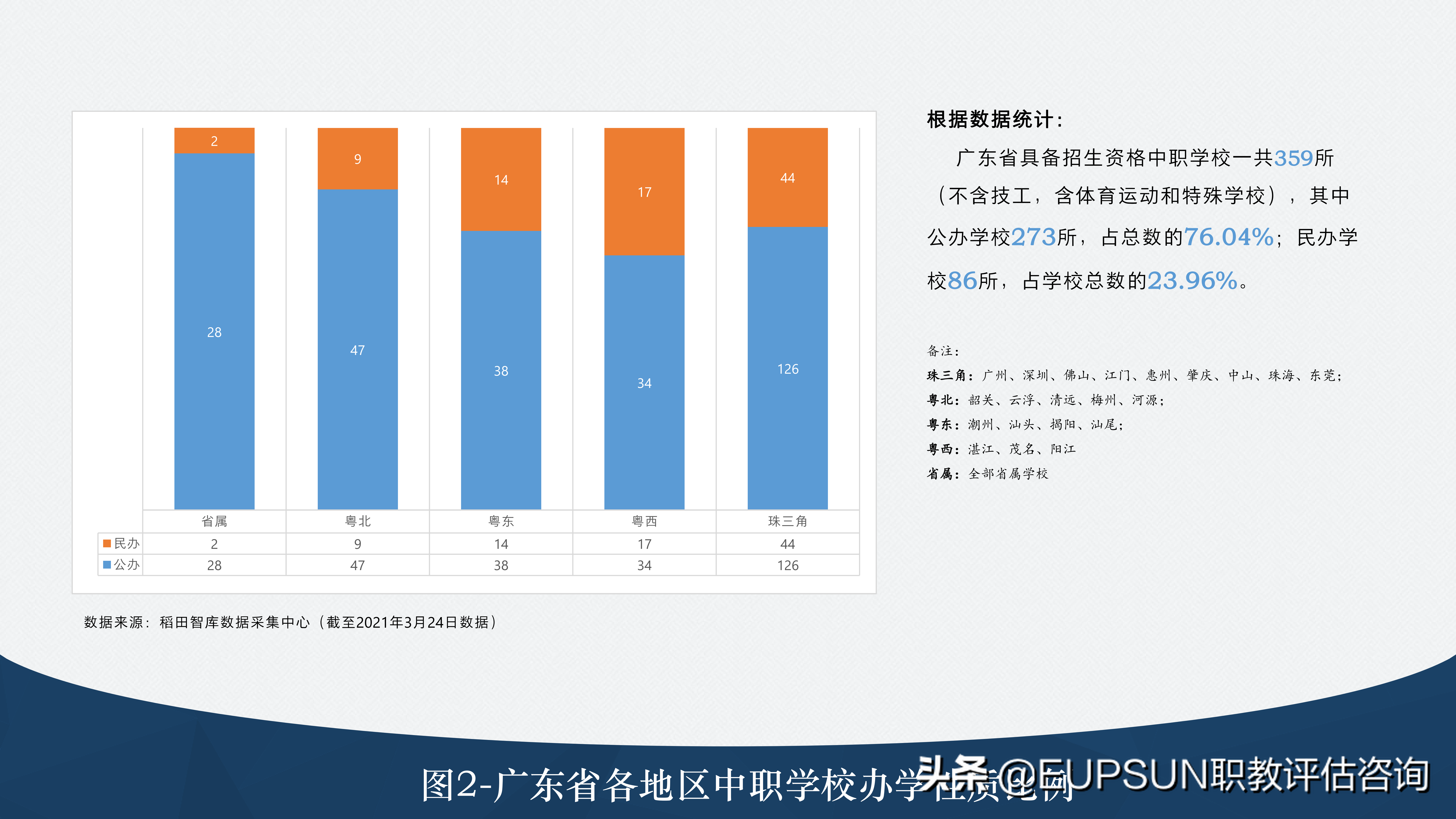 2021年,广东省具备招生资格中职学校一共359所(不含技工,含体育运动和特殊学校),其中珠三角170所,占总数的47%;粤北56所,占总数的16%;粤东52所,占总数的15%;粤西51所,占总数的14%;省属学校30所,占总数的8%。