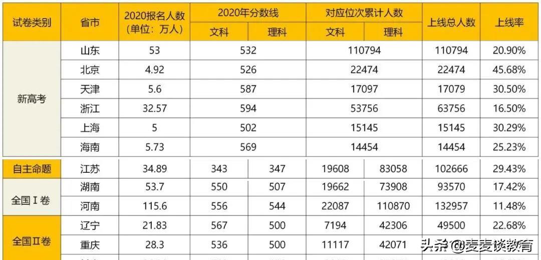 浙江今年是新高考模式,全省共有32.57万人参加高考,今年的本科一批线是594分,对应位次累计人数达到了53756人,而上线总人数是63756人,浙江今年一本上线率为16.5%。在新高考省市中,一本上线率是最低的。对比表中可以看出,新高考省市中上线率最高的是北京,达到了45.68%,也是今年全国最高的省市。