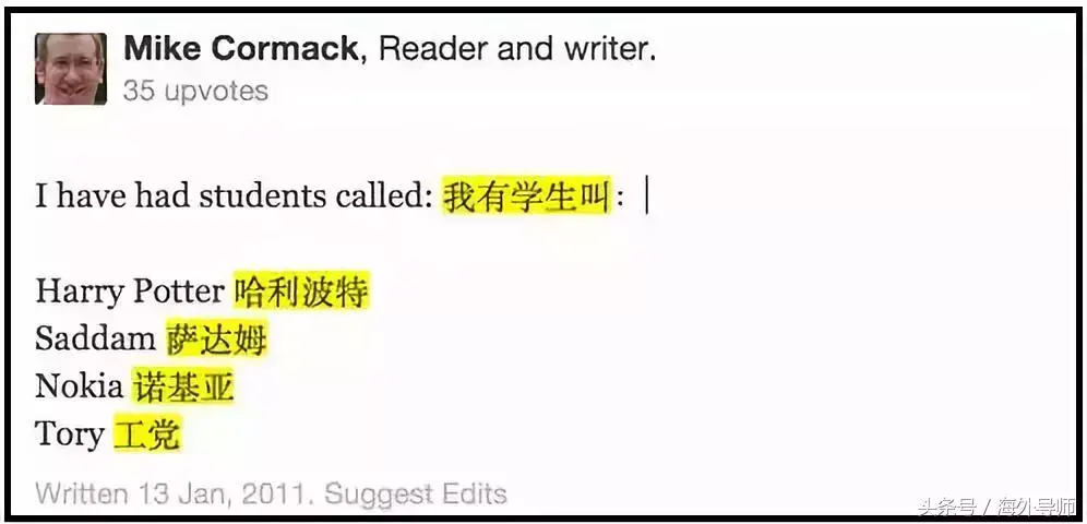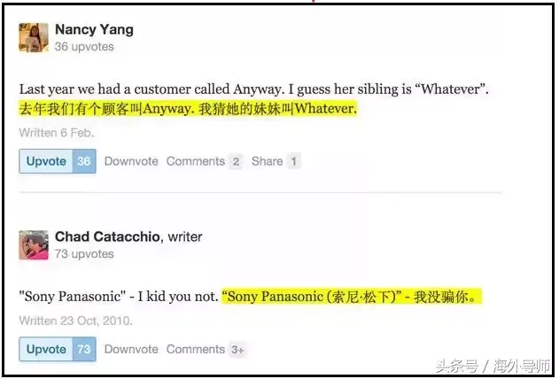 这个时候很多人才知道,当初随意取下的英文名字有多坑了...而且随着中国留学生越来越多,越来越奇葩的英文名让很多歪果仁都目瞪口呆。