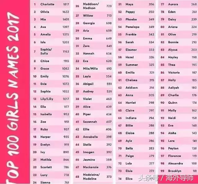 那么那些名字会显的高大上一些呢?网友排出了2017年最受欢迎的前100英文名。