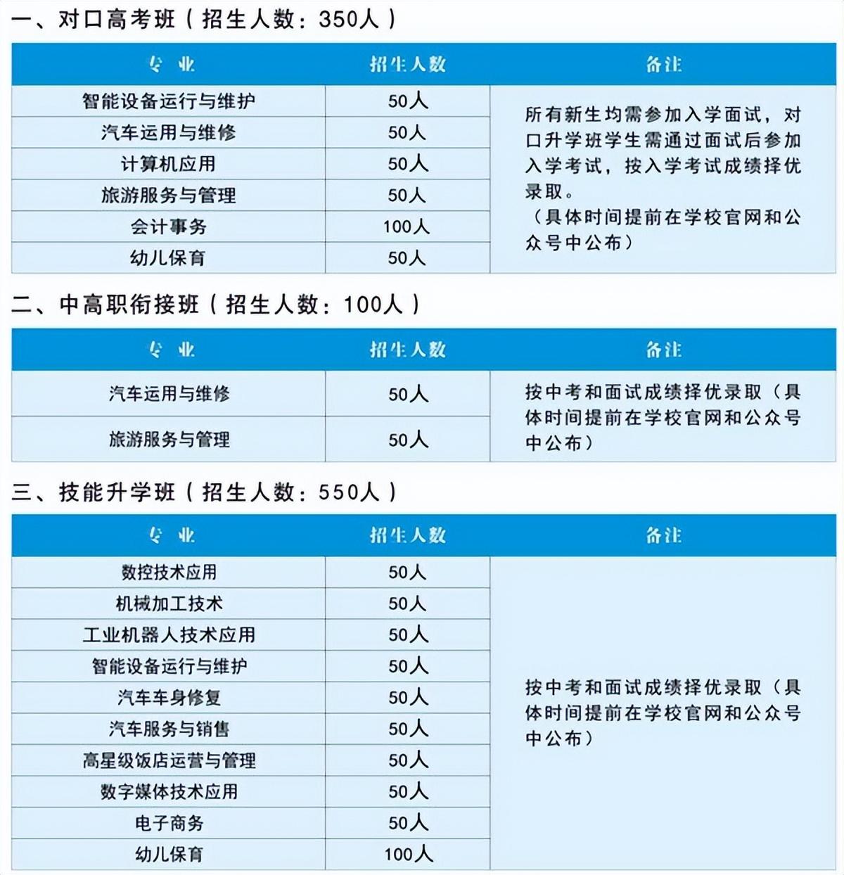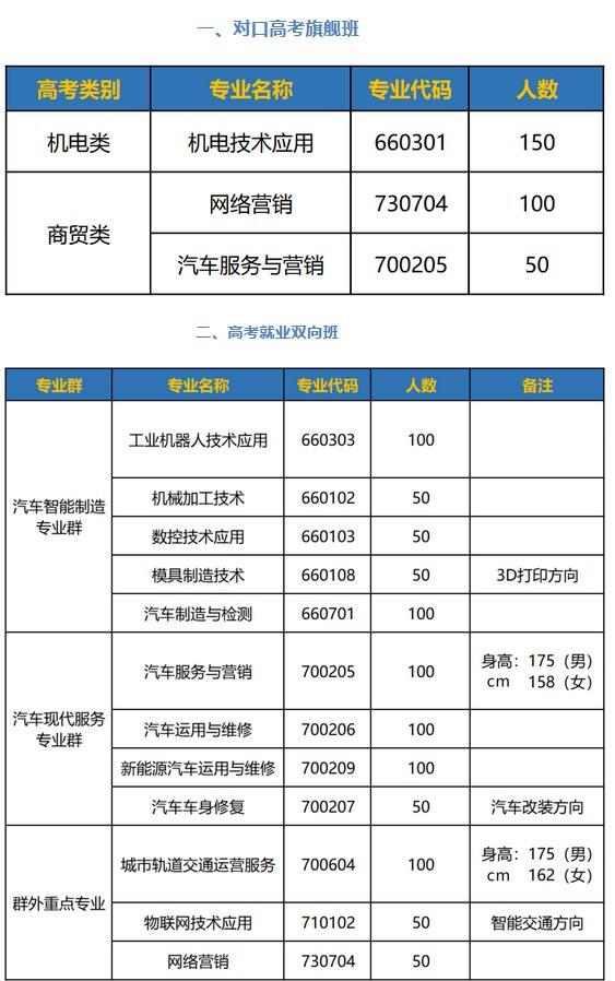 1、应届初中毕业生均可报考我校,要求品行端正,身心健康,无传染疾病,无纹身;男生身高164cm以上,女生身高155cm以上(另有部分专业的身高标准已备注在招生专业计划表)。 2、中考成绩需达到学校的提档分数线: 对口高考班:语、数、外总分达到三科总分的60%及以上。三年中职班:中考成绩达到全科总分50%。