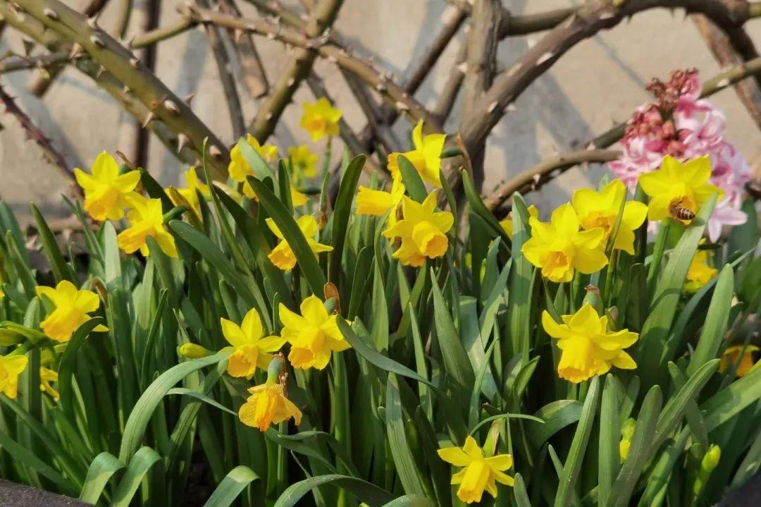 花园里,早春的洋水仙、银叶金合欢用明亮的黄色打破了冬日的沉闷,风信子、、银莲花、花毛茛等球根植物陆续开放,桃花树下芝樱开成了花球。