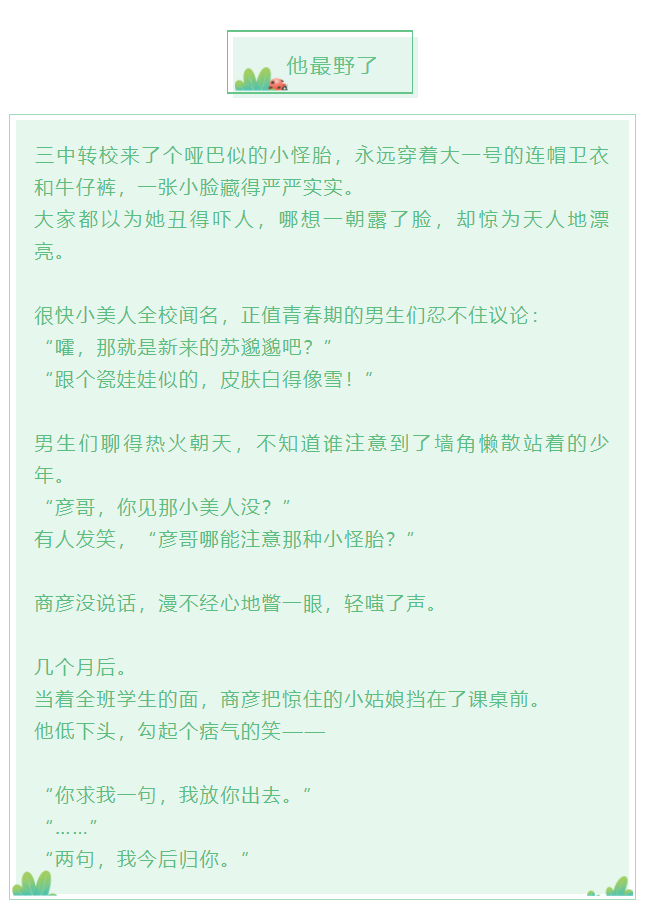 首先排个雷:彦哥学习超棒(除了语文),邈邈先天性心脏病,后期会做手术,但这是超甜的文,不甜你们打我,前期涉及计算机比赛,后期涉及数据分析团队创立,无原型。真的是很好的一个校园言情小说 至少能满足我对校园里“早恋”的期待和想象吧 看小说就是要看这样现实中很难找到的神仙爱情啊 看吧看吧!