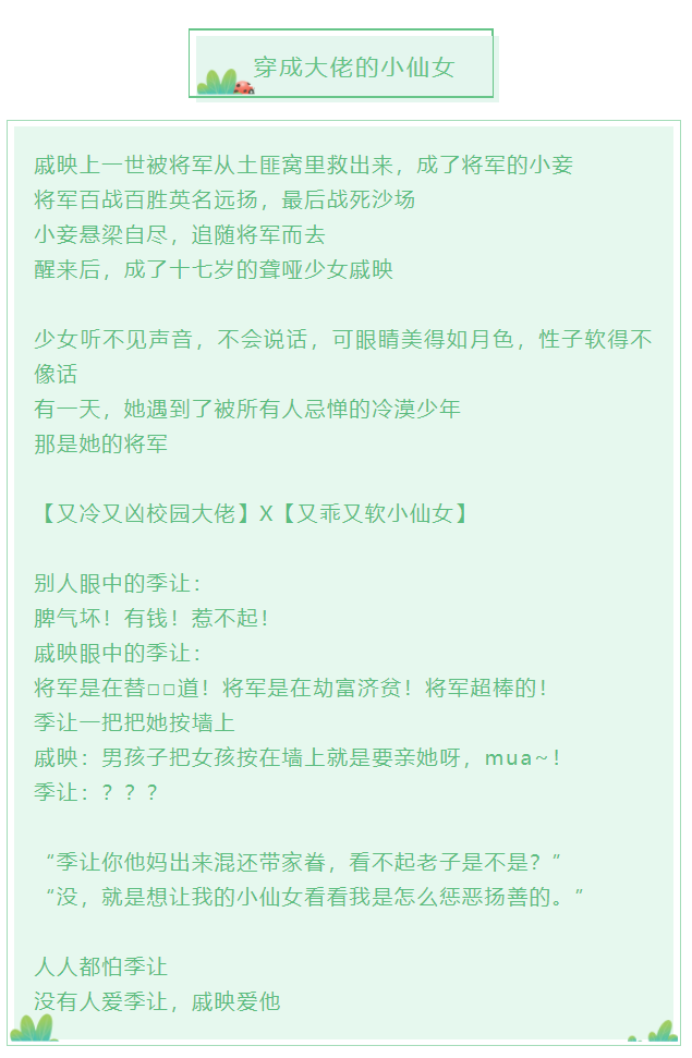 先排个雷:女主因意外导致失语症和听力障碍,后期会恢复,男主是将军转世,同一个灵魂,不是替身,这是一个互相治愈的温暖恋爱故事,甜宠撩,未成年不谈恋爱,高考前不在一起。