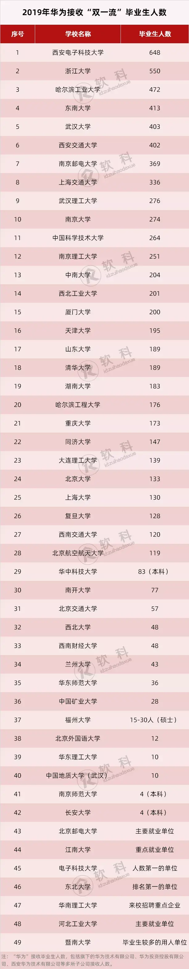 我们再来看看2019年软科发布的就业质量报告,有42所高校给出了毕业生在华为的签约人数,这份报告在一定程度上与上述院校名单对应。