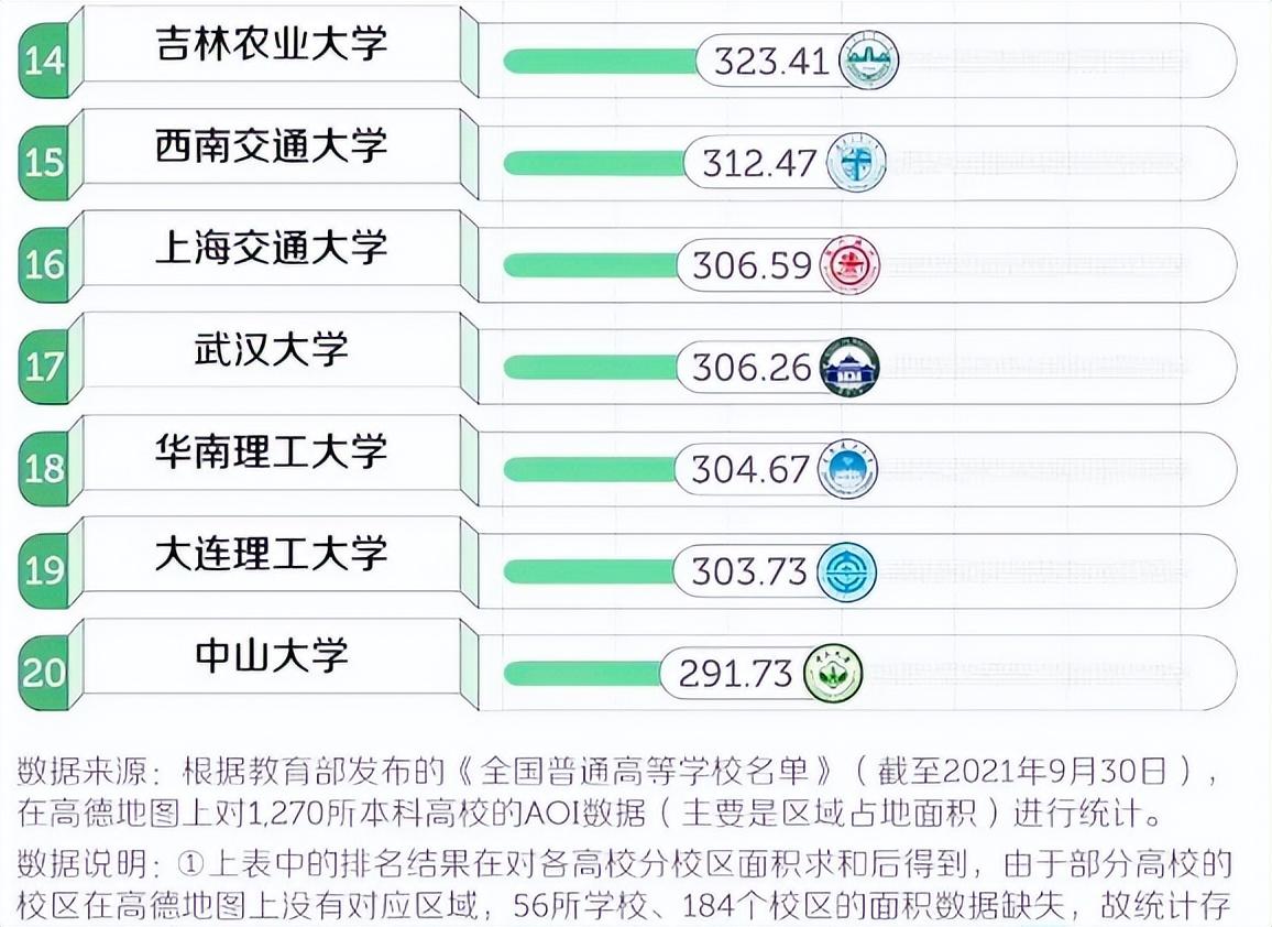 名校华中大是位列第10的位置,川大和厦大的面积也是相对宽敞的,比清华要相对大一些,最高学府清华位列第13,双非中的吉林农业大学面积也偏大,都超过了西南交大。