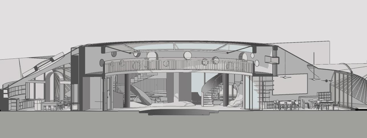 建筑内部大大小小的天窗、落地门窗的设置,模糊了室内外的界限,让孩子们即使身处室内,也能体会大自然四季的变化。一层中央是圆形的中庭大厅,中央设有梯田式下沉空间。在这里,孩子们抬手便可触摸到透过天窗洒落的阳光,抬眼便可仰望日月星辰。中庭的二层有一条环廊,既连接着二层的各个区域,也给孩子们提供阴雨天在室内追逐的场所。