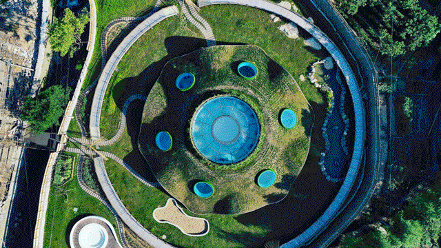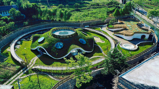 它像春日里绽放的花朵,柔和的曲线勾勒出童年的美好时光;又像一颗雨后破土而出的蘑菇,起伏间散发出生命的活力;最像一艘动画里的飞船,外墙上的每一面玻璃都是孩子们窥探世界的窗口。绿色的草坪覆盖了建筑的屋面及其四周,外围的环廊既圈出了主园区的范围,也给孩子们创造了自由奔跑、追逐、嬉戏的条件。环廊周边还零星的布着些小菜地,那是让孩子们在与大自然接触中收获成长的美好体验。