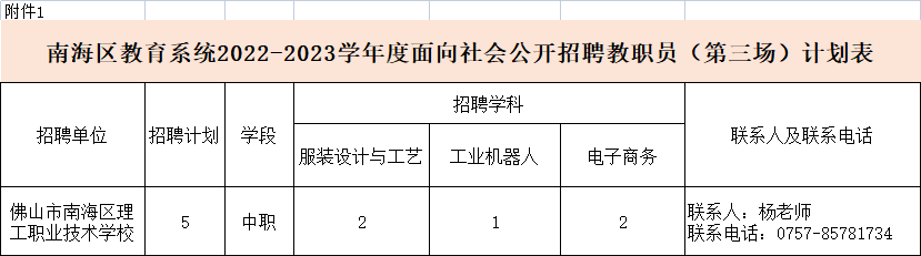本次招聘公办教职员5名。详见《南海区教育系统2022-2023学年度面向社会公开招聘教职员(第三场)计划和岗位表》(附件1)。