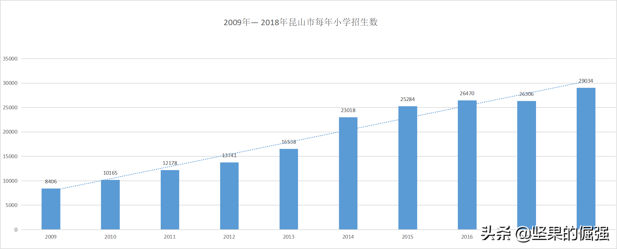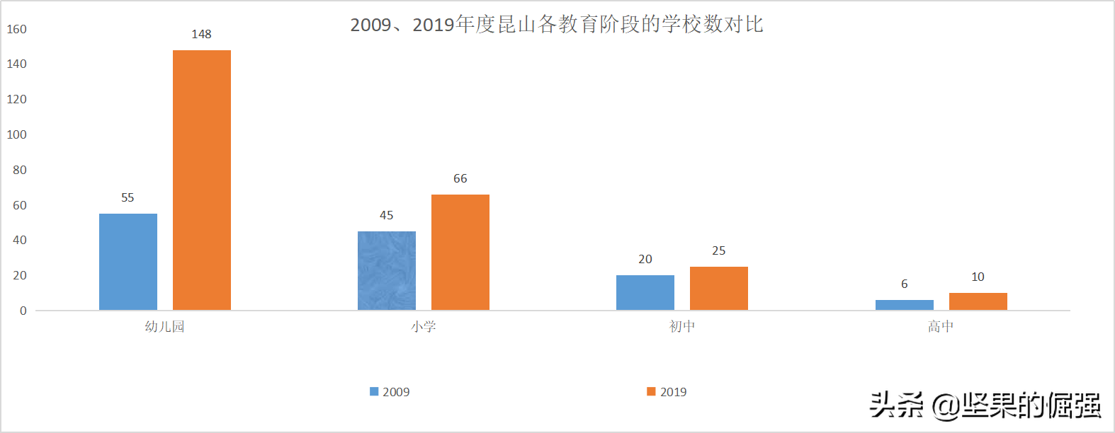 2009年,昆山幼儿园数是55所、小学45所,初中20所以及高中6所。到2019年,幼儿园148所,小学66所、初中25所以及高中10所。10年间,幼儿园数新增了169%,小学新增了46.7%,初中新增了25%。