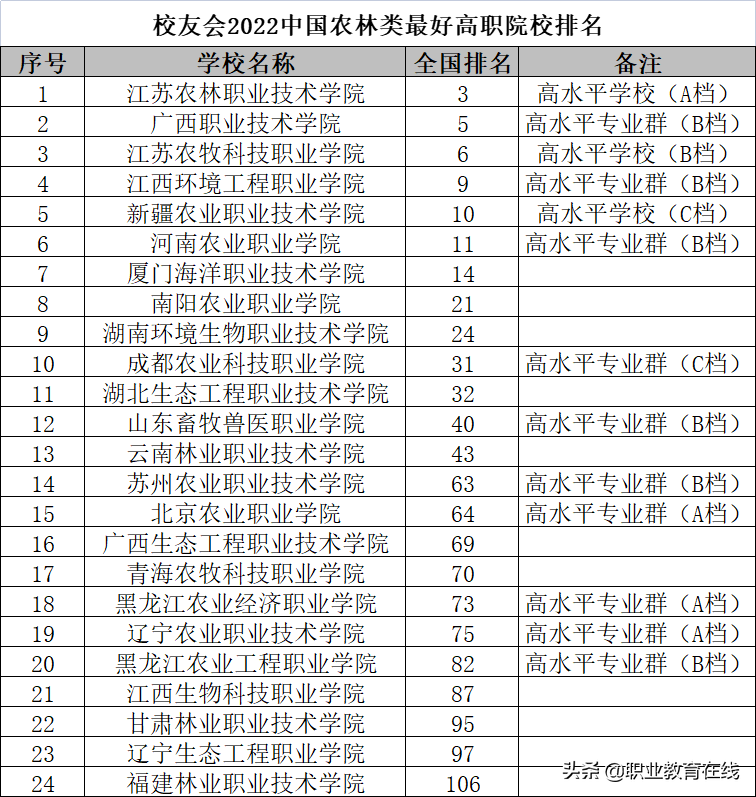 在校友会2022中国最好高职院校排名上榜的中国农林类高职院校中, 江苏农林职业技术学院位居2022年全国第3名,排名冠军。广西职业技术学院在全国排名第5名,排行第2。江苏农牧科技职业学院全国排名第6名,位居第3。江西环境工程职业学院在全国排名第9名,位居第4。新疆农业职业技术学院在全国排名第10名,排名第5。
