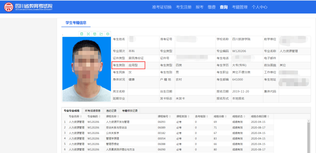 自考考籍展示(考籍注册后可在省教育考试院自考报考系统中查询,注册后可参加最近一次考试):