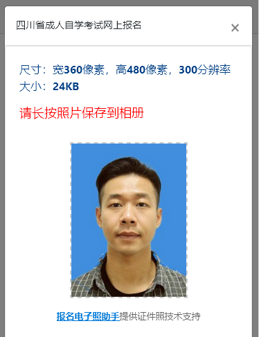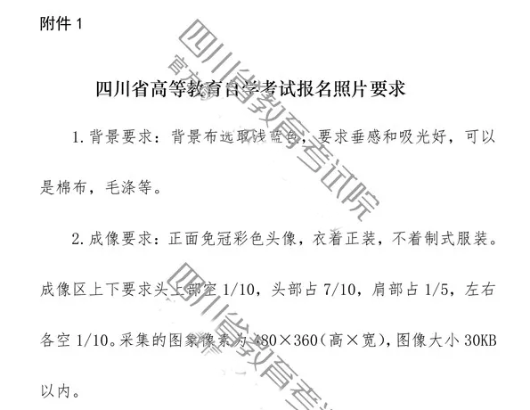 报名注册参加自学考试的新生,需自行在四川省自学考试考生端上填报本人基本信息及上传本人着正装免冠浅蓝底标准证件照片。照片要求如下: