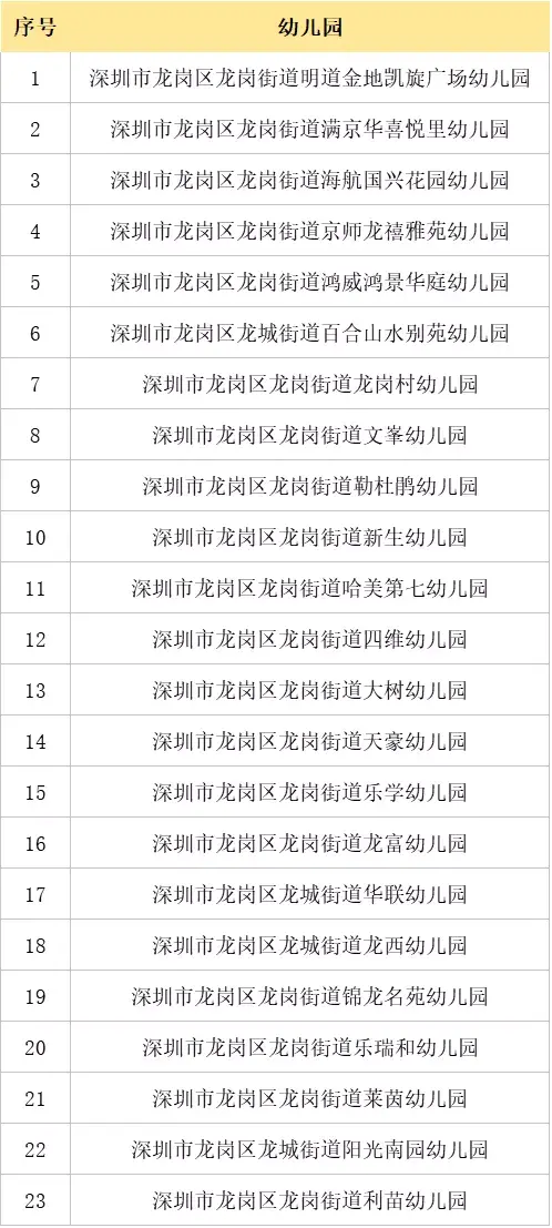 2020年龙岗街道民转公幼儿园23所,加上原有的2所公办园和政府产权到期直接转公的2所幼儿园,龙岗街道公办幼儿园达到了27所,具体名单如下: