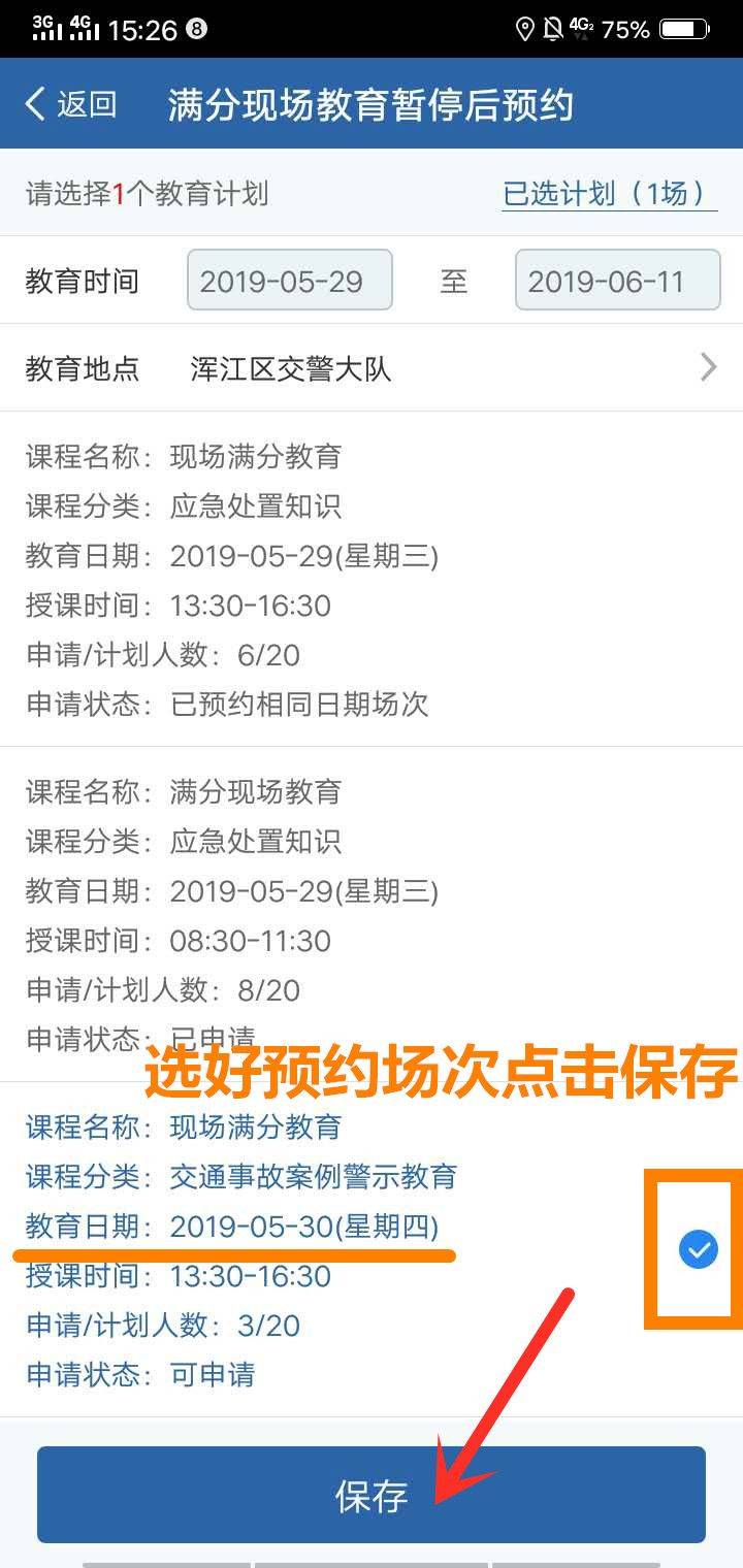 选好满分现场教育场次后点击保存。【原则上暂停了多少场次就需要预约多少场次】