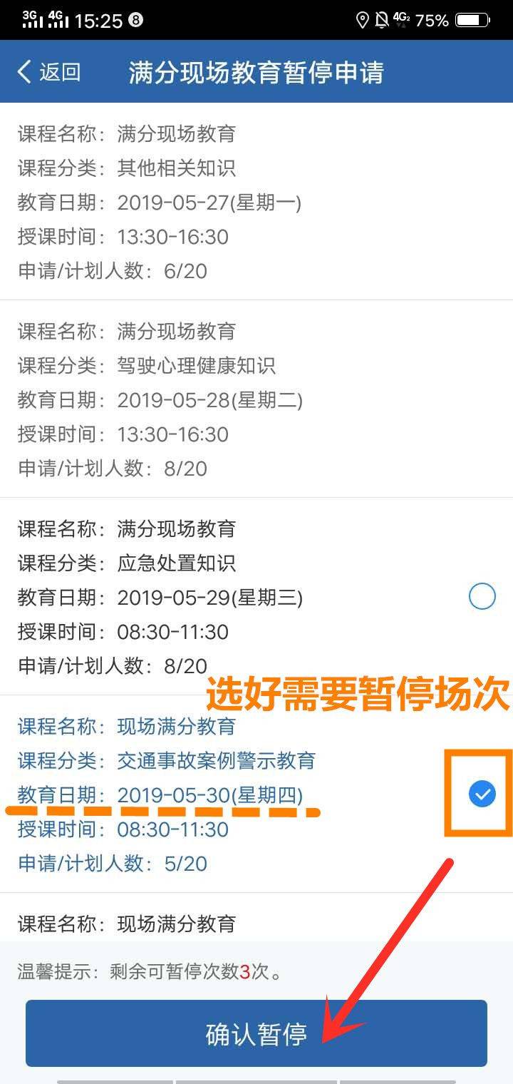 点击“下一步”,选择暂停日期后,系统会提示待暂停现场教育。