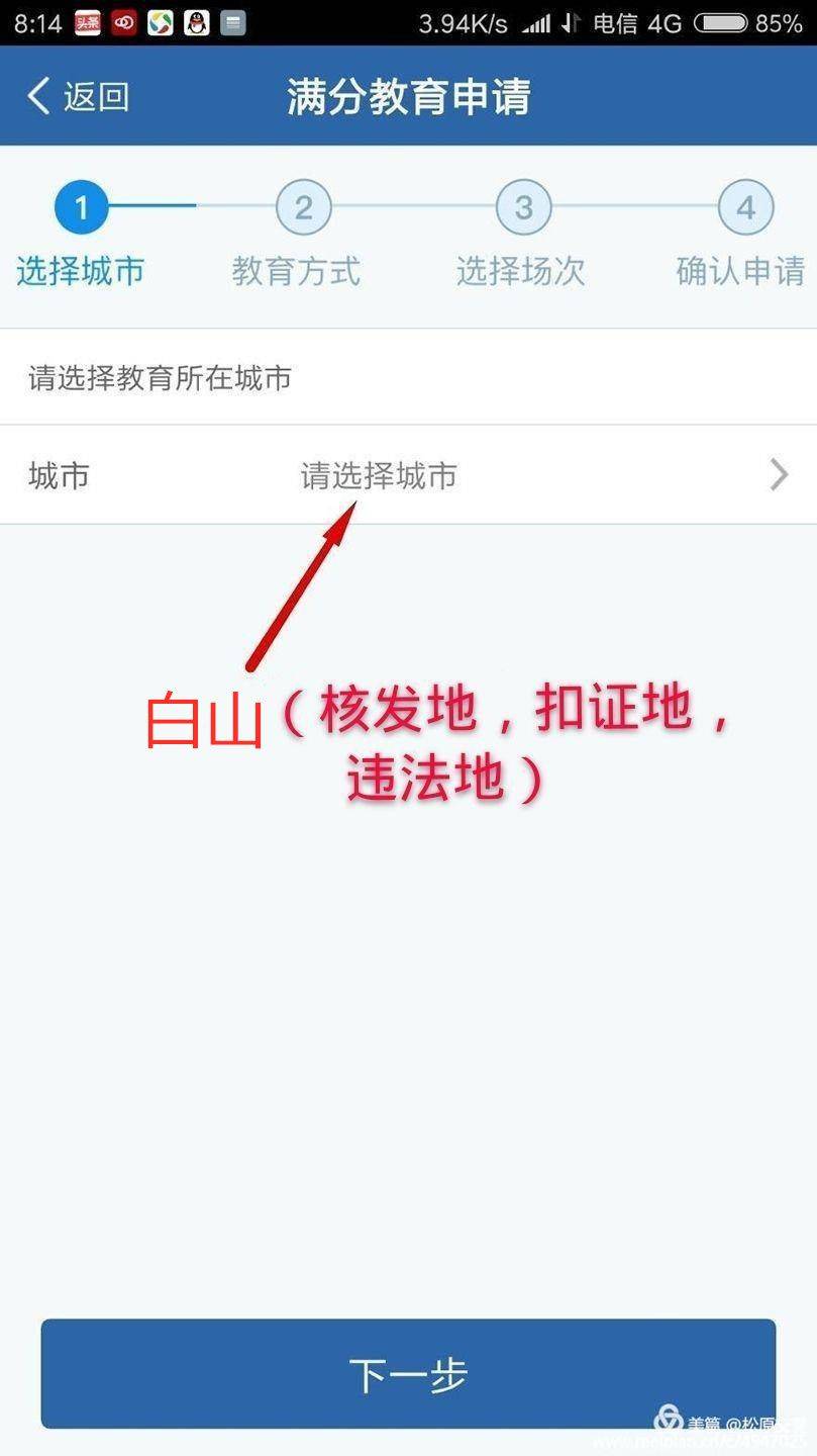 如果因系统原因在提交申请这一步出现(下图所示)的提示信息,请您本人携带身份证和交管部门开具的强制措施凭证到白山市浑江区交警大队一楼处罚室记满十二分驾驶人学习登记处受理窗口进行办理该项业务。