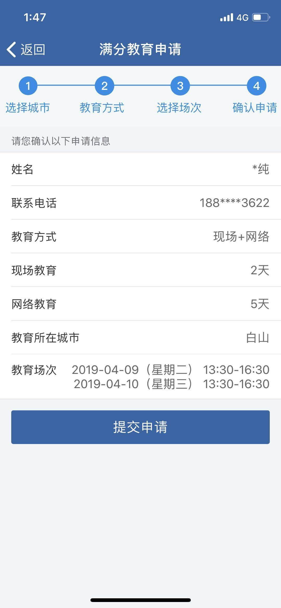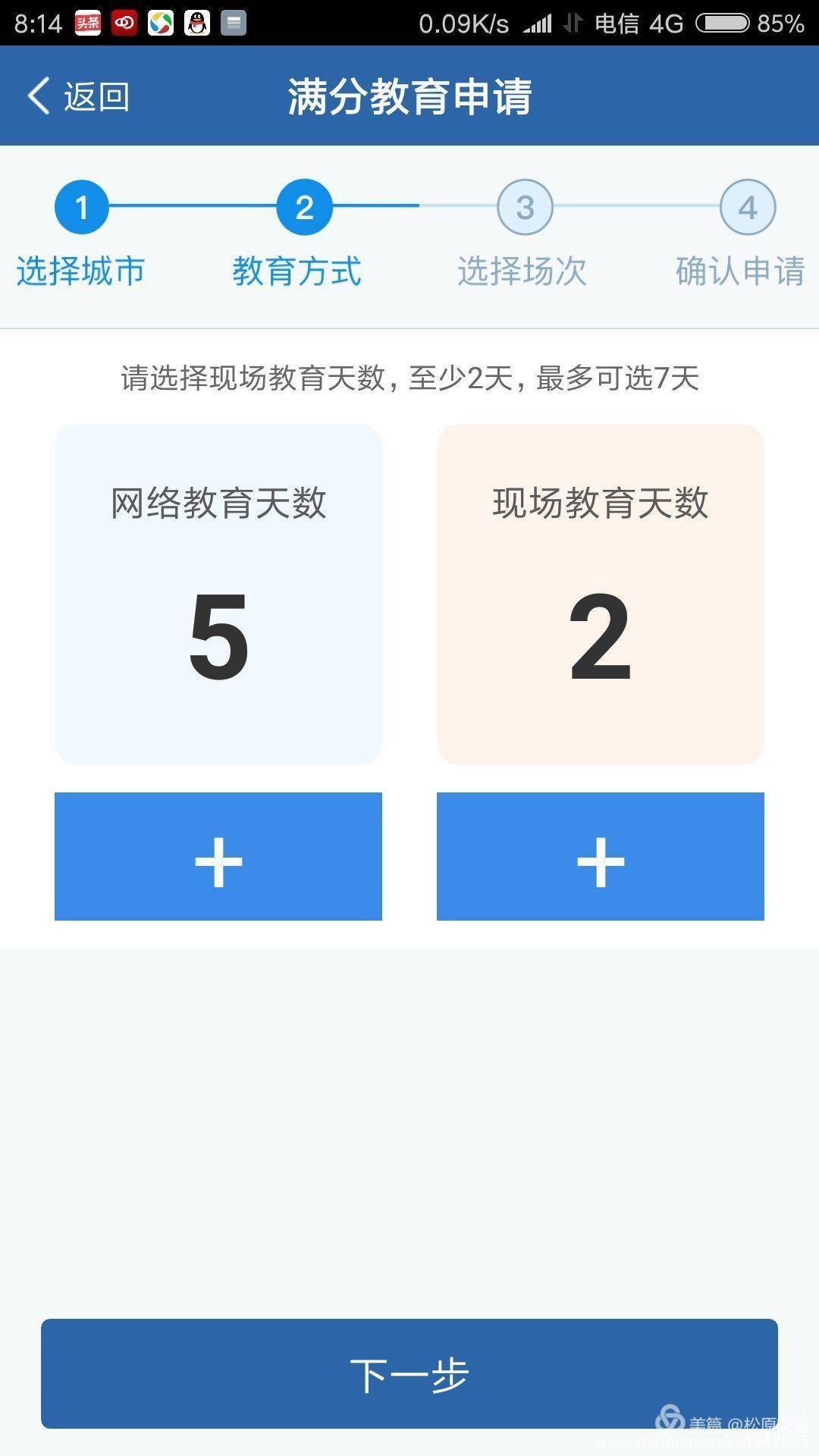 5.在该步骤,用户选择教育方式,并确认现场教育天数(系统自动计算最少需要参加现场教育天数,选择天数不能少于该值)。确认后进入下一步预约参加现场教育场次时间。