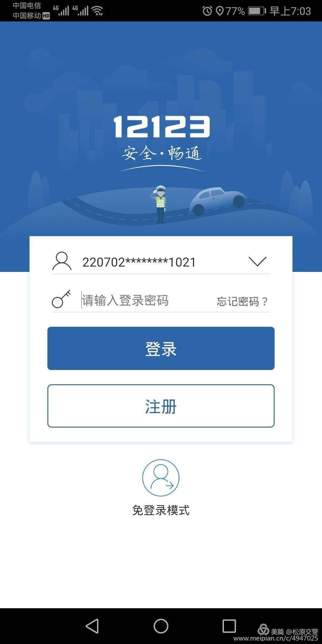 1.输入身份证和注册时设置的密码,登陆“交管12123”