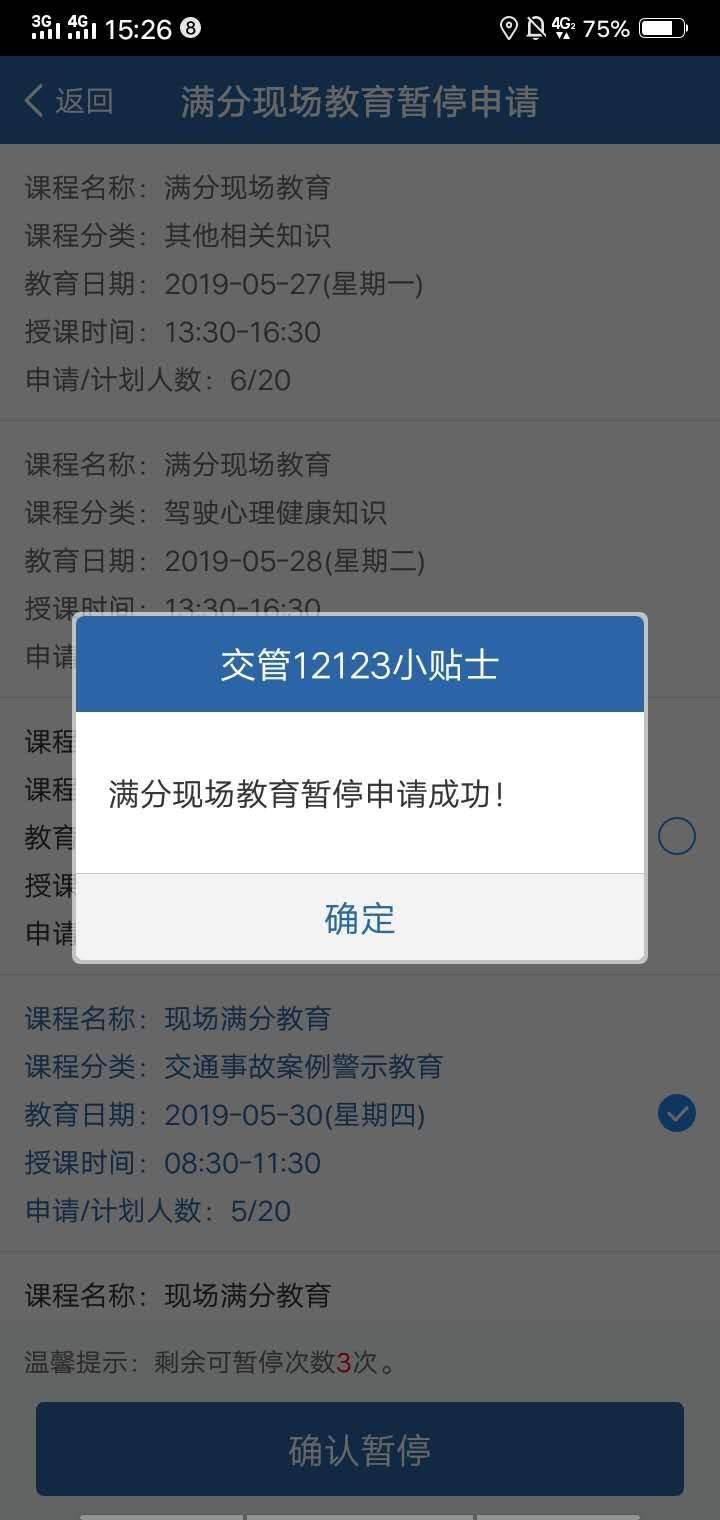 满分驾驶人登录【交管12123】APP,进入菜单【满分现场教育暂停申请】